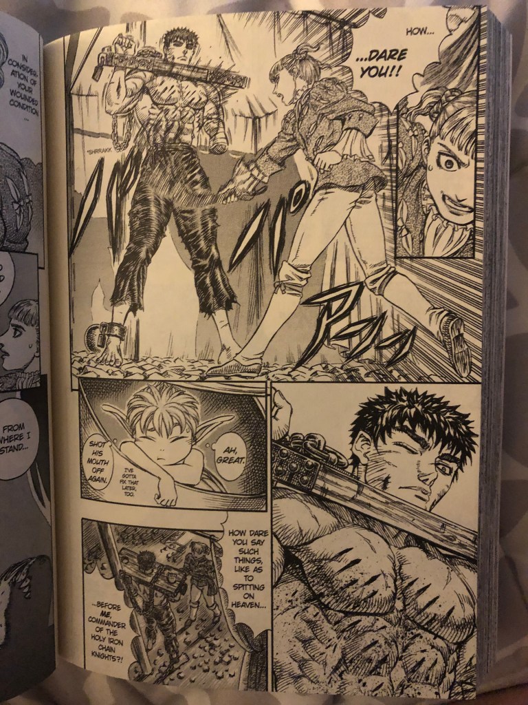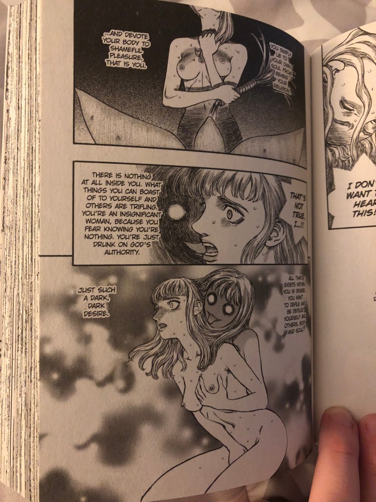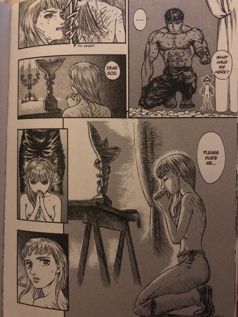Aptly named the morning of truth, this chapter deals with Lady Farnese’s realization that religion and a society that hails such dogma ultimately stifles a women’s desires. As the devil incurs further into Farnese’s sexual desires, she becomes increasingly terrified of how her so desired nakedness is being overturned into nudeness. The same which she perceives killed her mother. The demon, who has omnipotence over Farnese’s emotions, alludes that Farnese used her nakedness as a perceived nudity with religion. Her sin was being washed away with her nudeness, as God observed Farnese cleanse herself. Here, after the demon takes control of Farnese, she literally straddles Gut’s gargantuan blade, the ultimate representation of the phallus. As day finally breaks, and the morning of truth arrives, the golden rays of sunshine cleanse Farnese of the demon. She weeps as she gains consciousness straddling Gut’s sword. She knows that her perceived nudeness with religion has now been revealed to be her own nakedness, and fears how society and ultimately herself can live with knowing her true self. Berserk presents such a harsh and unforgiving world, for at its core, it’s a story about how a male dominated society disenfranchises and puts women down.