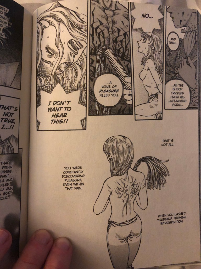 Here, we see Lady Farnese inflict blow upon blow on Guts. She is lashing out at his bare naked chest. Guts is nude to Lady Farnese right now, for she has all the control over him, too look at him, and do as she pleases. As we learn later, her hatred comes from Gut’s easiness to disown her religion. The religion that chains Lady Farnese to nudeness rather than the nakedness she wants to experience so overwhelmingly badly. For context, Lady Farnese’s mother was burned at the stake when she was a child for heresy. We eventually learn it’s over perceived witchness which we in the 21st century would call normal. This fractured Lady Farnese’s psyche. Scared to live the life of a modern women for shame of society, she takes power in nudeness for the clergy in order to suppress her wish for personal nakedness. Berger argued that nudeness occured at the gaze of others, whilst nakedness meant to be within one’s own self.