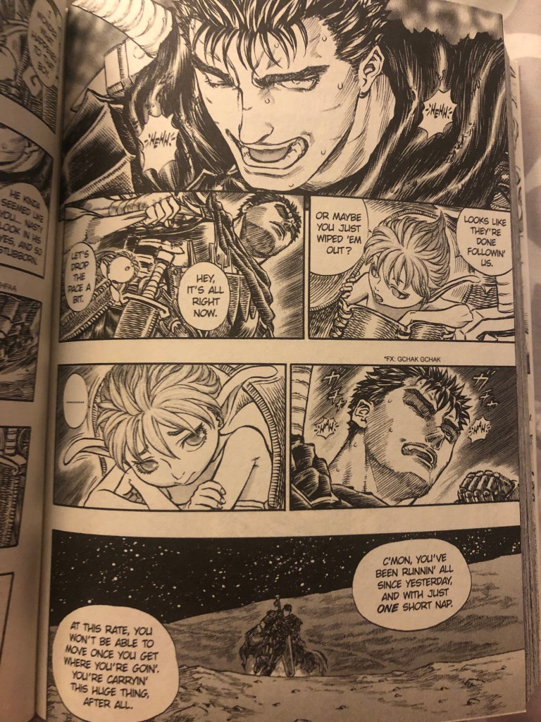 Immediately following the rescue of Isidro and the defeat of the wheel demons, Gut’s begins sprinting again. As his elf friend notes, it’s been a whole day of him running. This page represents social distancing perfectly. In the first panels, we see Guts as he is physically running. We know this because the intimate look we have on just his face shows his sweat and exhortation. As Puck realizes that Guts is still running for no reason, we zoom out slightly to a less intimate look, followed by an intimate focus on the elf Puck as he himself takes a look at Guts. The initial intimacy on Guts, followed by a mid shot, then with intimate shots of Puck analysing Guts sets up the narrative Miura is designing. We are following Puck’s realization of Gut’s feelings through social distance on Guts. At first, like Puck, we just assume Guts is running from the wheel demons. But as the shots widen, the whole picture is revealed. It crescendos into the final shot of Guts with the night sky and rolling hills in the background, as we get a long view of Guts, foot to head. This reveals how Puck, someone that can feel the emotions of others, slowly understands that Gut’s is running to get to his love, he’s sacrificing his body and self to save someone else. His whole world. And social distancing shows us this through the transitions of personal to long shots of Guts.