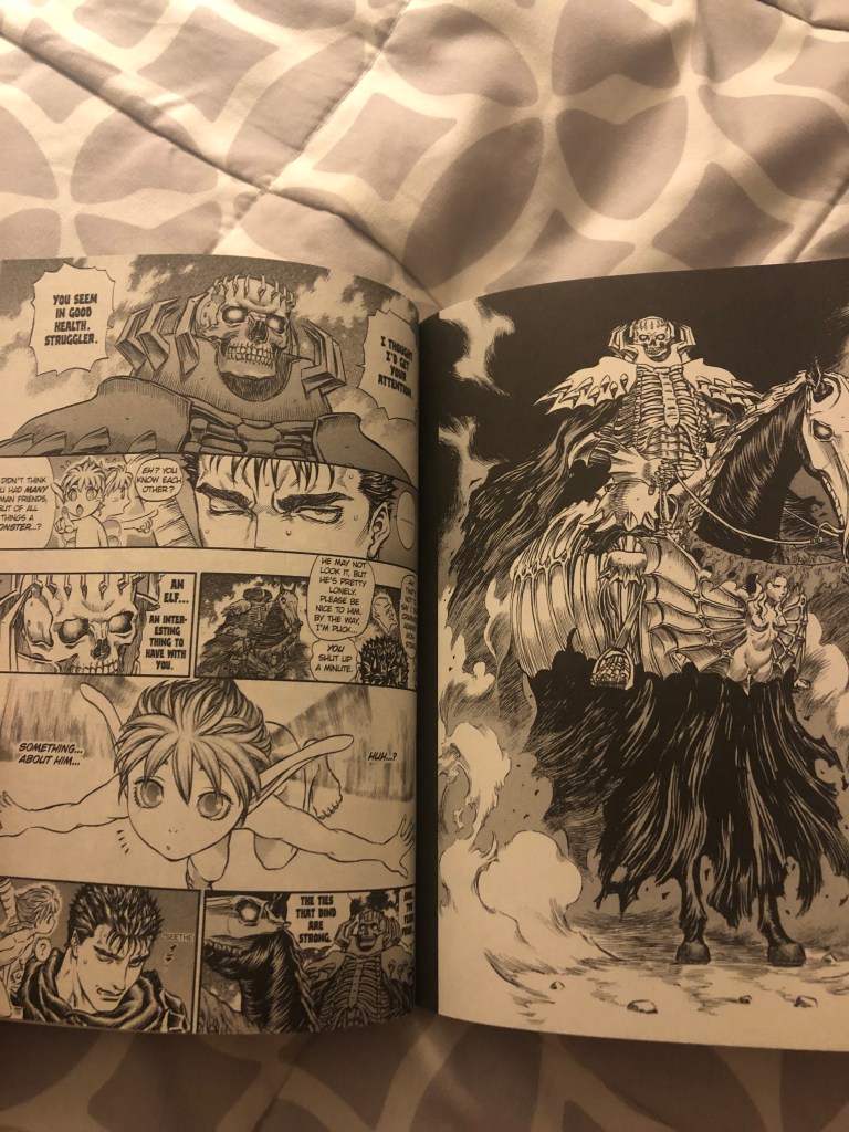 And finally for a little bit of fun, frame size also implements tons of meaning! This is a really cool example because the art of the skull knight is sublime. This page is again from Puck’s perspective, as Guts has actually met the skull knight before. The first page on the right (remember, Manga is read left to right, but the page order is backwards, so you read the right page first) tells us this fact because it presents the skull knight in his usual intimidating fashion. The frame is that of the whole page, signifying his importance to the story. Yet, on the second page, when the skull knight states you’re in good health, accompanied by Gut’s reaction, we know that Puck know sees the Skull knight as a non-threat. The frame size, all of them being quick cuts of just particularly faces, shows the now conveyed familiarity!